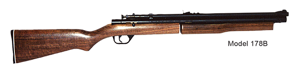 The model 176B is a long gun version of the model 179B pistol. It is smooth bored and uses CO2 cylinders. It was actually in production for three years before the pistol. It can handle the larger capacity darts, although you will still be restricted in usable distances as compared to a cartridge fired model. Temperature issues and a count of the number of times it is fired on a per cylinder basis is still required.